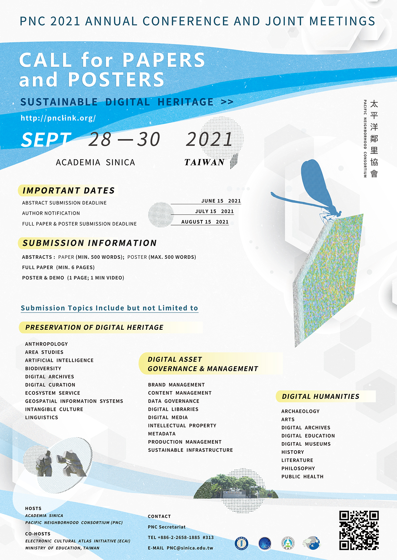 It is our great pleasure to announce that the PNC 2021 Annual Conference and Joint Meetings (PNC 2021) will be held in Academia Sinica, Taiwan from September 28th-30th, 2021, accompanied by online access to a virtual version of the conference. The main theme of the PNC 2021 is "Sustainable Digital Heritage."