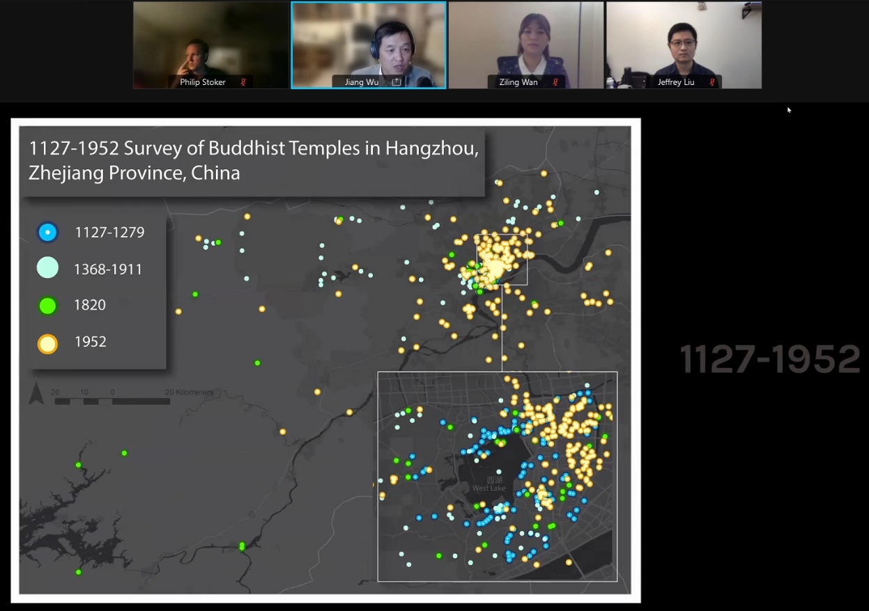 Jiang Wu visualized Buddhist temple distributions over time in Hangzhou.