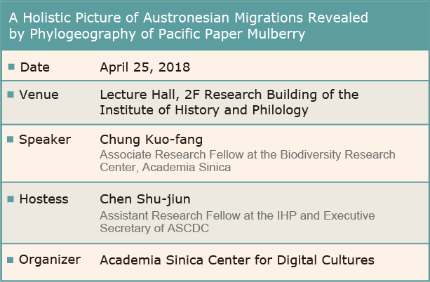 He walked into the lecture hall with a twig of Pacific paper mulberry in hand, and said to the audience: "I'm a botanist." This is how Chung Kuo-fang opened his lecture titled "A Holistic Picture of Austronesian Migrations Revealed by Phylogeography of Pacific Paper Mulberry." Then the associate research fellow at the Biodiversity Research Center, Academia Sinica confessed that he had plucked the twig near the gate of Taiwan's national research complex.