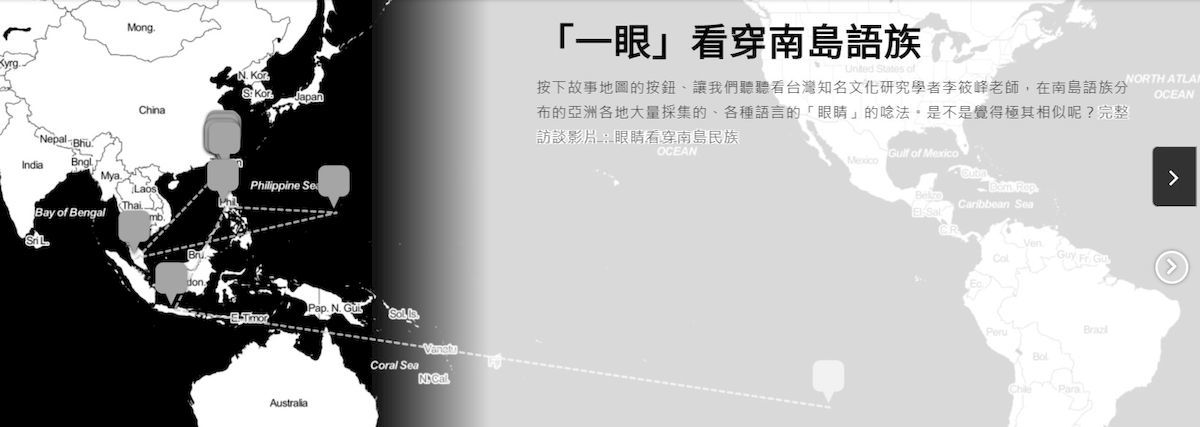 「再訪,有構厲害」展運用故事地圖模組,讓觀眾親耳聆聽與感受各地南島語族相似的語言。