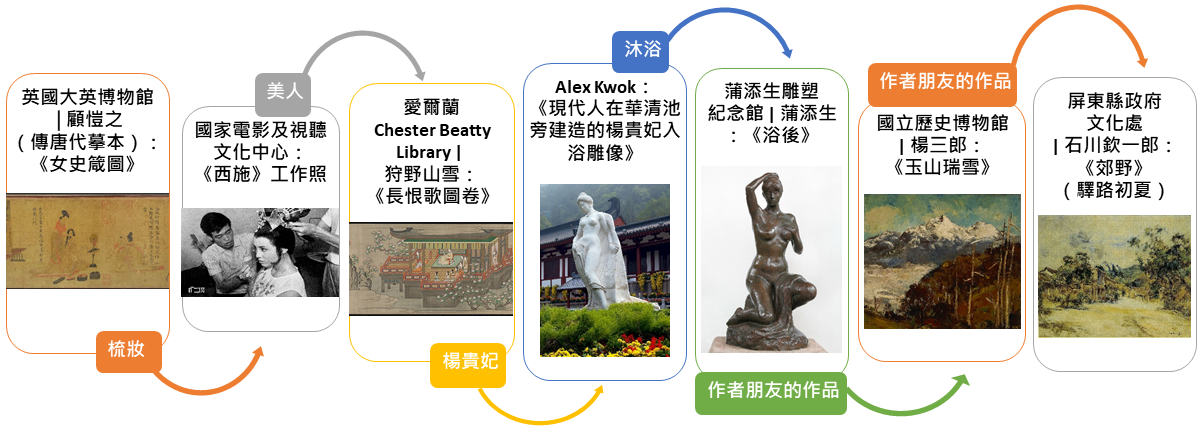 大英博物館(The British Museum)所藏東晉顧愷之的《女史箴圖》、電影《西施》的工作照、蒲添生的雕塑作品《浴後》、臺灣學校美術教育開創者石川欽一郎的風景畫《郊野》(驛路初夏),看似風馬牛不相及的作品竟互有關聯?原來,民眾進入「連∞結世界」活動專頁後,可透過不同的藏品內容主題,如「梳妝」、「美人」、「沐浴」,甚至「作者朋友的作品」等線索,循序將英國大英博物館所藏之1千多年前畫作,與臺灣多家文化機構所藏之近代臺灣藝術家的風景畫、雕塑,乃至電影連結起來,展現時間、地理與藏品類型上的跨度。