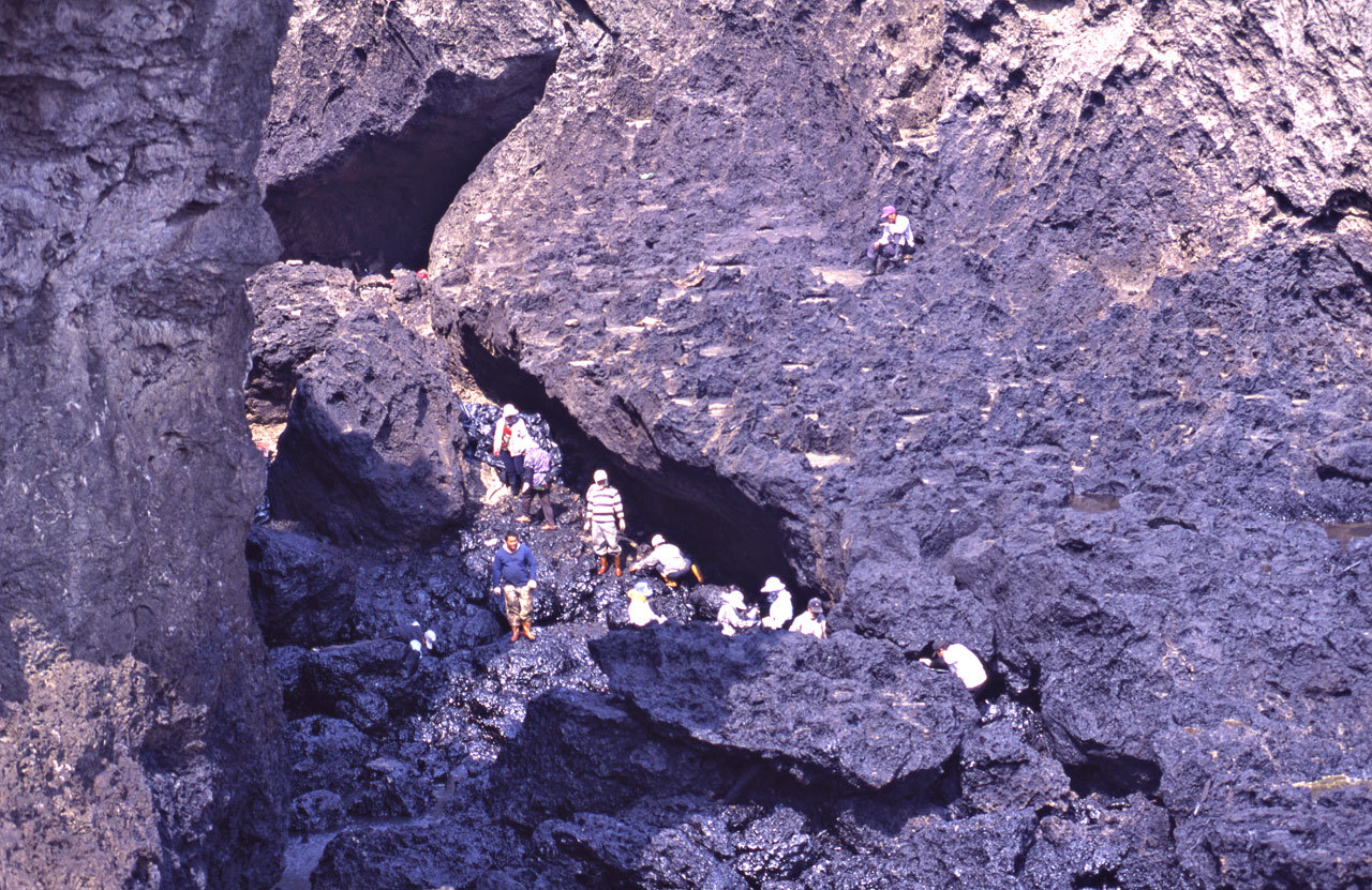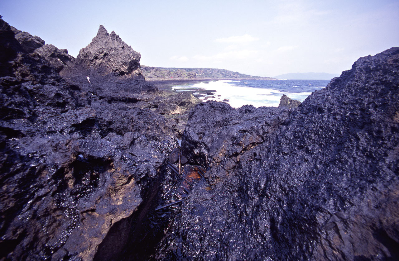 隨著潮汐,龍坑海岸受到汙染,礁石上染得片片黑墨。