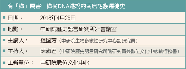 故事說到這裡,鍾國芳問了問現場大多是年輕人的聽眾:「你能想像千里之外的大洋洲南島語族所種的構樹,和中研院門口的構樹,是有關係的嗎?」而我們要如何告訴世界,關於臺灣構樹的故事。他表示,將繼續蒐集更完整的太平洋南島語族的構樹DNA,並計畫提供構樹傳播時間更堅實的證據,以呼應與人類學「出臺灣說」一致的傳播路徑。