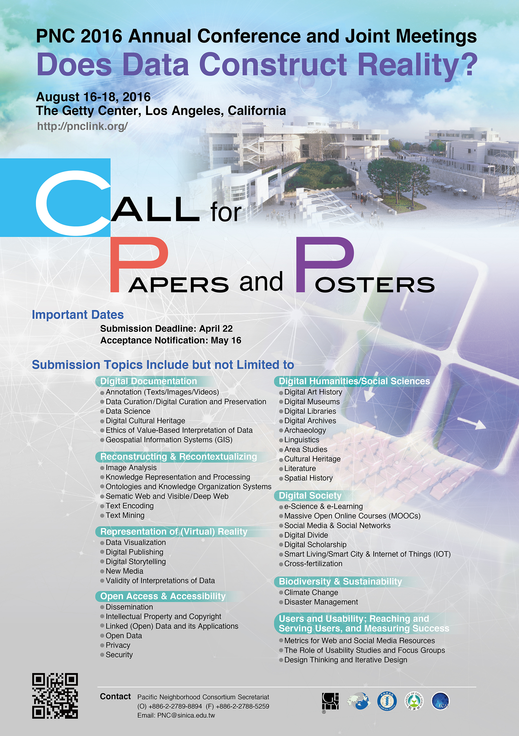 太平洋鄰里協會(Pacific Neighborhood Consortium, PNC)2016年年會暨聯合會議大會論文摘要(Call for Papers)及學術海報徵求活動(Call for Posters)自即日起開始至2016年4月22日截止,歡迎針對相關主題踴躍參加。