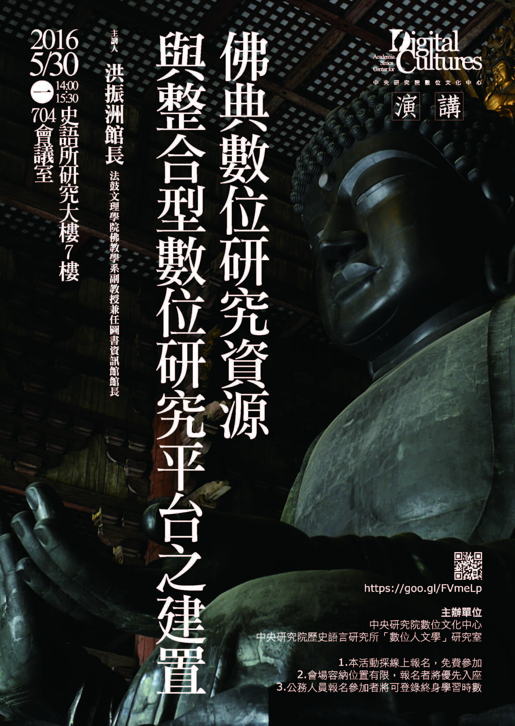 焦點訊息 近期消息 【專題演講】佛典數位研究資源與整合型數位研究平台之建置 (5/30)