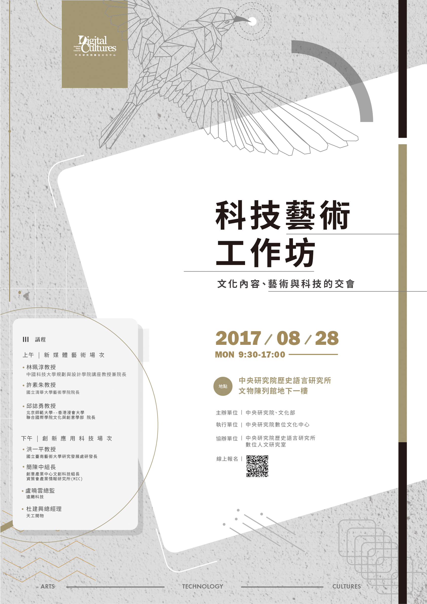 「中央研究院數位文化中心」承接國家數百萬筆的數位典藏內容,希望能結合文化內容、藝術、科技,透過跨域之數位化研究及展示,與社會連結,促進民眾對數位文化之共享共創。目前臺灣有不少館舍及閒置空間整理開放,未來擁有許多充滿想像的展示空間,需要內容進駐與加值。本工作坊內容涵蓋科技藝術創作、文化內容詮釋轉譯、數位科技應用、實際展演策展,希望透過工作坊增進跨領域工作者對科技藝術之知識與技能,開啟未來對話與合作之可能。