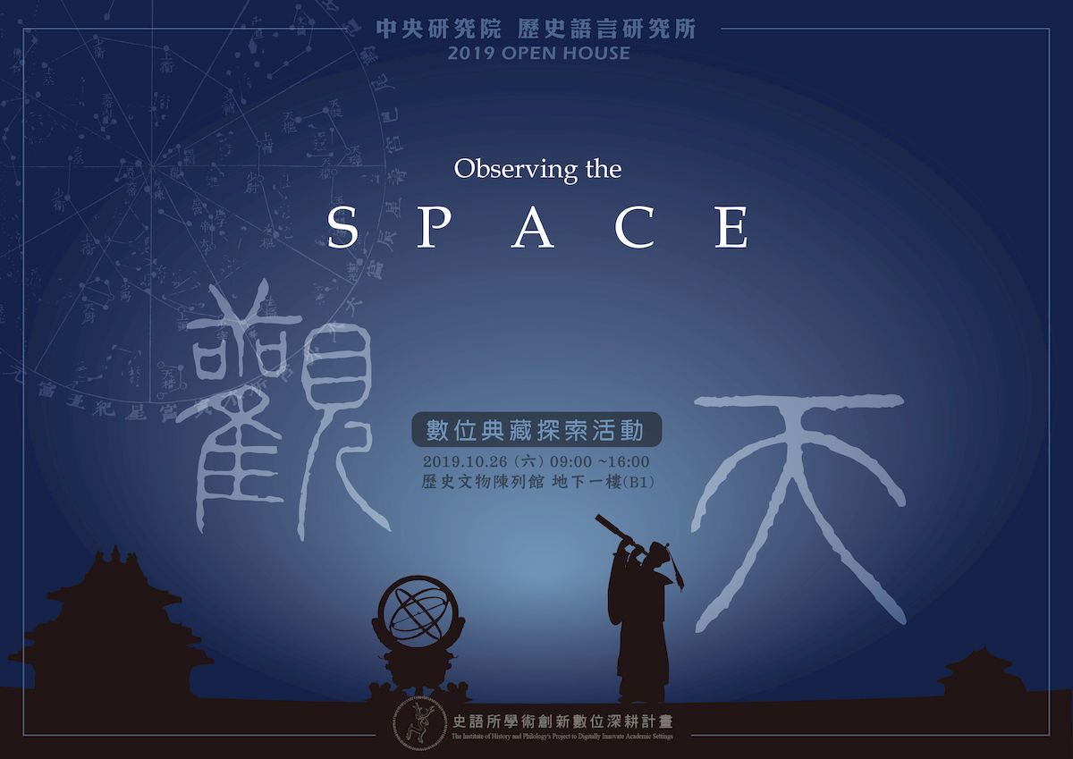 「史語所學術創新數位深耕計畫」特於中研院院區開放日,舉辦「觀天」數位典藏探索活動。透過甲骨文、善本書籍上的觀天紀錄,以及欽天監對天象觀察所獲得的天體運行規律等檔案的記載,進而猜測、推敲與詮釋天文的萬千變化。