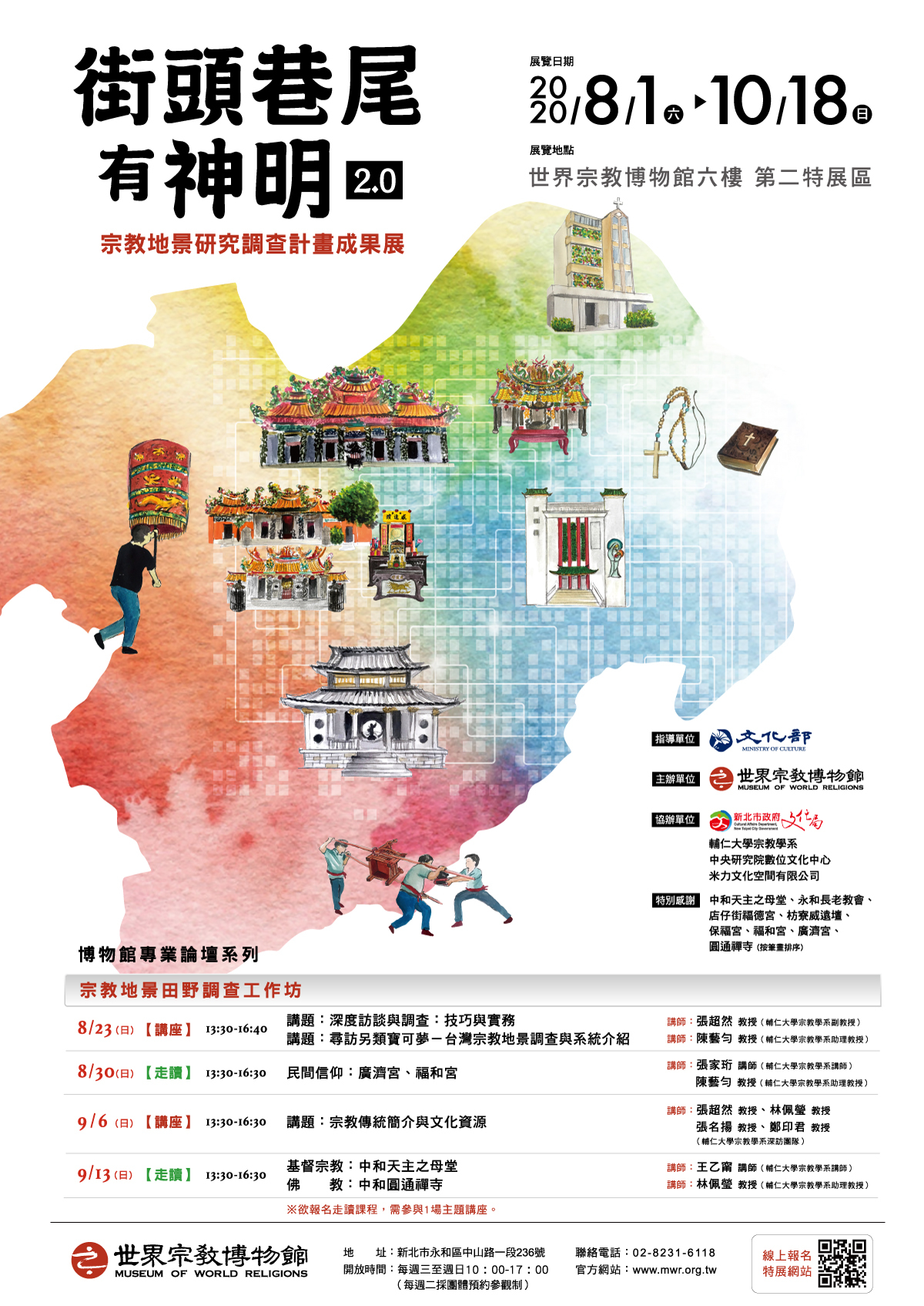 天主教、基督教、佛教、道教、民間信仰等宗教在臺灣如何生根發展?各大宗教的宗教建物是何面貌?只要於8月1日至10月18日期間到訪「街頭巷尾有神明2.0-宗教地景研究調查計畫成果展」,即可一窺究竟!