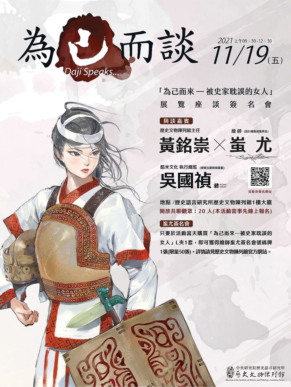 這些都將由策展團隊:策展人黃銘崇(史語所研究員兼文物館主任)、繪師蚩尤(設計繪製妲己形象)及酷米文化執行總監吳國禎(展覽互動技術籌畫),為大家談談那些展覽背後的小故事。