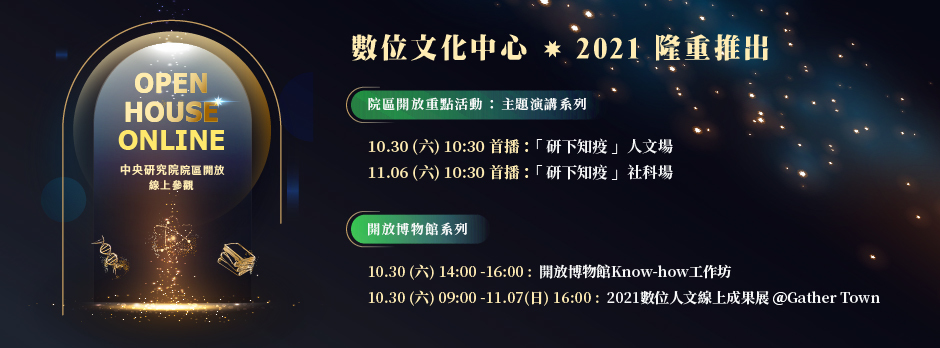 主題演講之外,本中心亦將於10月30日下午2時,線上舉辦「開放博物館Know-How工作坊」。專案經理許正欣及企劃專員藍萱將概述當今數位博物館運作的基礎知識,並以實際案例說明「開放博物館」的特色——匯集來自世界各地博物館的開放藏品、中研院研究成果轉譯的科普展覽,以及大量合作館所打造的精采線上展示。同時引導民眾透過今年上線的「開放博物館.參與」平台,學習如何使用開放授權藏品與展示模組,輕鬆打造自己的線上展覽。