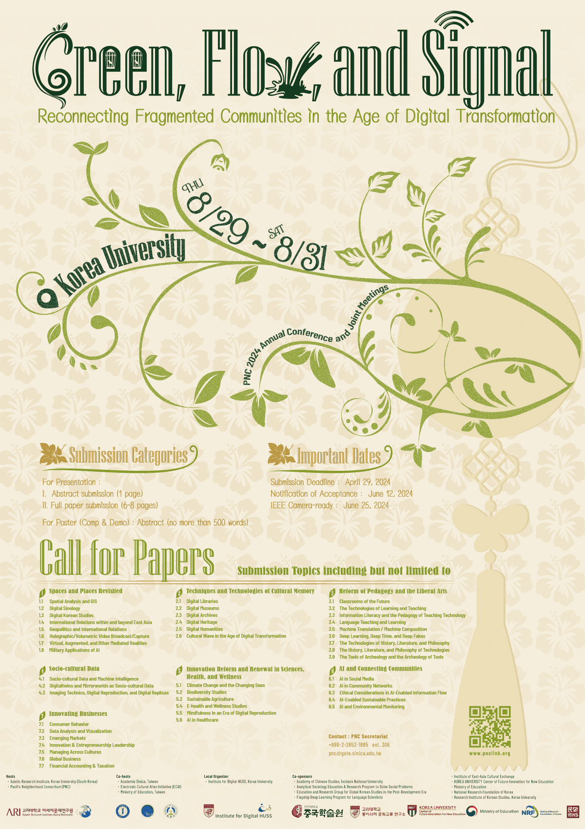 太平洋鄰里協會(Pacific Neighborhood Consortium, PNC)2024年年會暨聯合會議大會學術發表論文暨海報徵求活動(Call for Papers and Posters)至4月29日(週一)截止,歡迎針對相關主題踴躍參加。